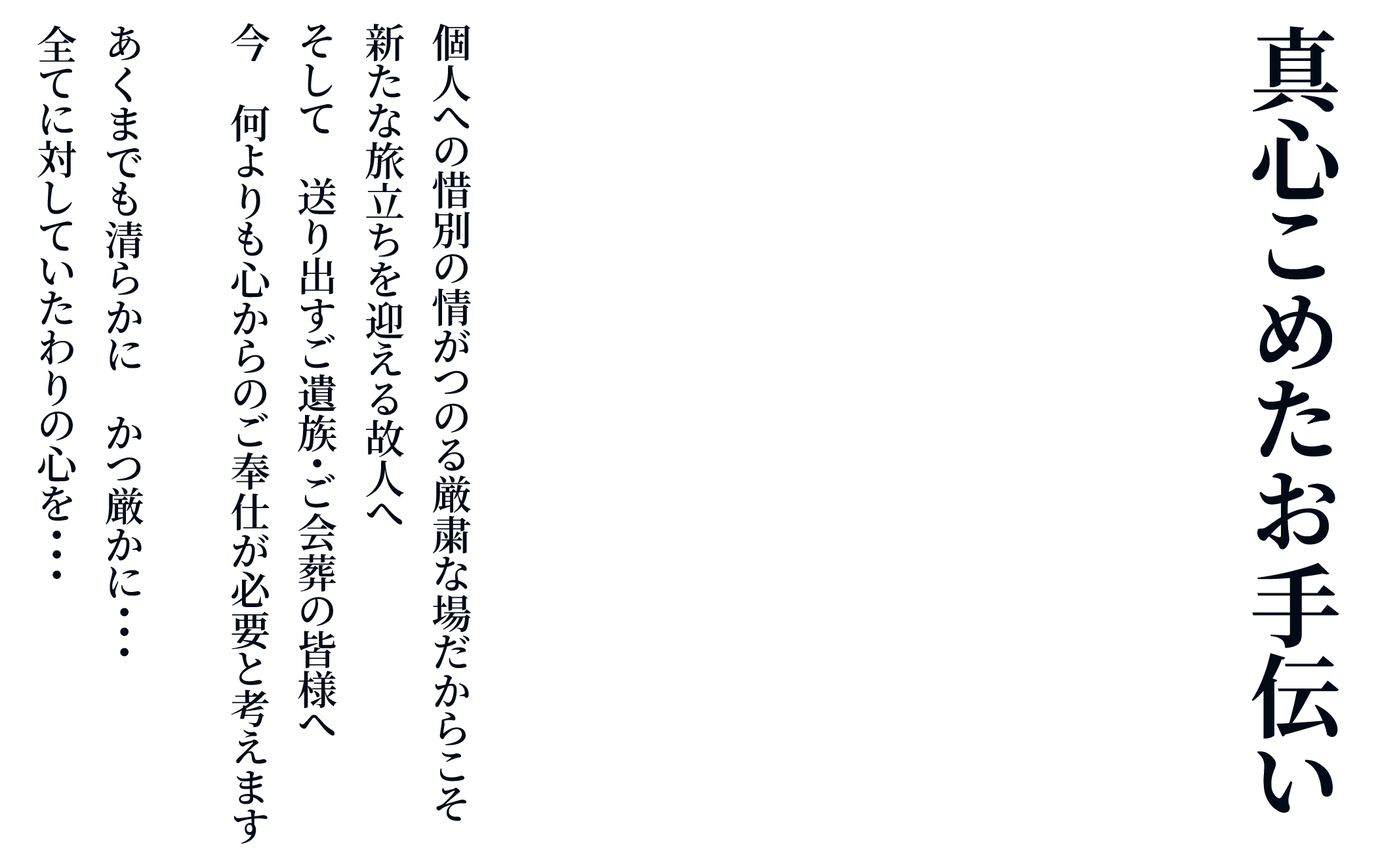 通夜・告別式・法事法要など、ご利用していただく皆様に対し、ご満足していただけるように誠心誠意をもってお応えさせていただきます。